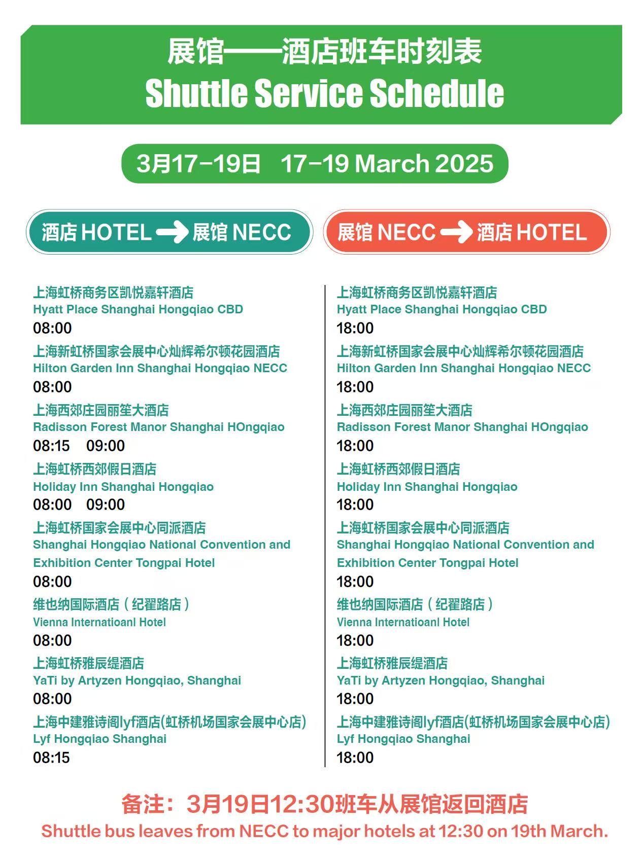 ◎接駁車:部分酒店提供至展館免費(fèi)接駁班車,班車時(shí)刻表如下。